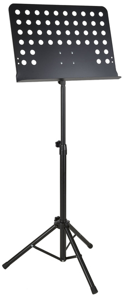 Statyw posiada perforowaną metalową płytę o wymiarach 47,5 × 34,5 cm, co zapewnia dobrą stabilność dla zapisu nutowego i partytur. Dzięki mechanizmowi typu „bayonet” płyta może być szybko montowana i demontowana. Cała konstrukcja wykonana jest z metalu, a blok nóg stanowi element cynkowy, co zwiększa trwałość i sztywność statywu. Do zestawu dołączony jest pokrowiec z nylonu ułatwiający transport i ochronę sprzętu.