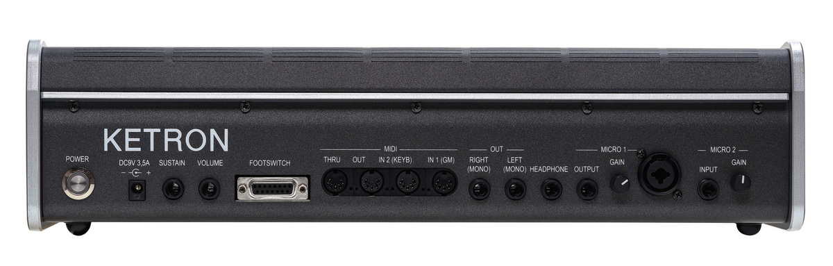 - Złącza z tyłu obudowy: Main Out (L/R), Aux 1 & Aux 2 (L/R), słuchawkowe, pedału sustain, pedału volume, footswitch, Midi In1, Midi In2, Out, Thru, Line In (L/R), Micro 1, Micro 2