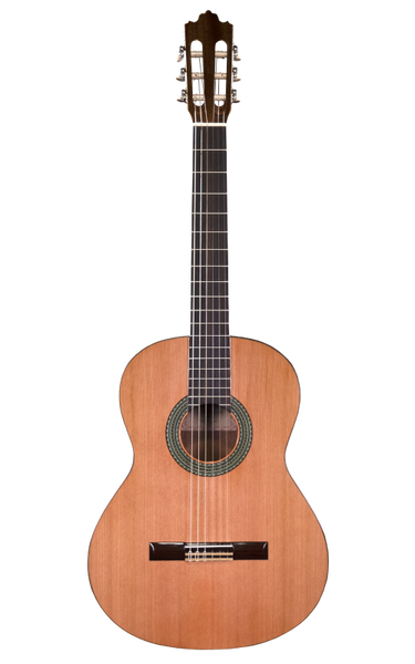 - Starannie dobrane drewno: Wybór drewna jest kluczowy, aby stworzyć dobry instrument... Starannie dobrana płyta wierzchnia z litego kanadyjskiego cedru, wykończona błyszczącym lakierem, z podwójnym klonowym bindingiem i tradycyjną iberyjską dekoracją wokół otworu rezonansowego.