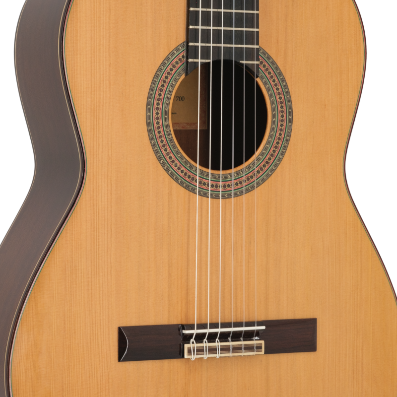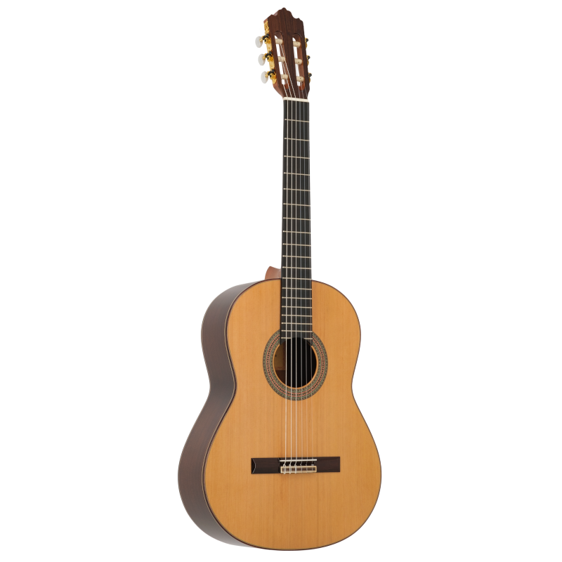 - Starannie dobrane drewno: Wybór drewna jest kluczowy, aby stworzyć dobry instrument... Starannie dobrana płyta wierzchnia z litego kanadyjskiego cedru, wykończona błyszczącym lakierem, z podwójnym palisandrowym bindingiem i tradycyjną iberyjską dekoracją wokół otworu rezonansowego. Boki i tył gitary zostały wykonane z litego afrykańskiego mahoniu.