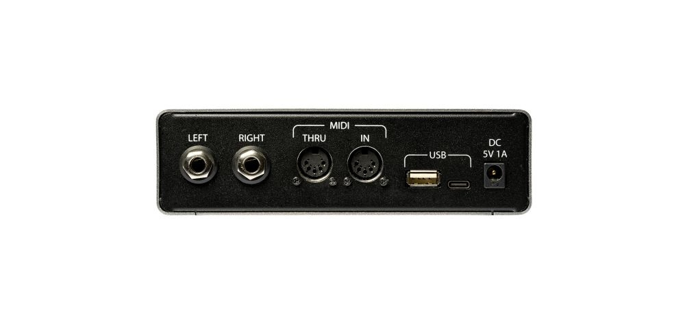 - Złącza: Główne wyjście lewy/prawy, słuchawkowe, MIDI In, MIDI Thru, USB host (MIDI), USB device