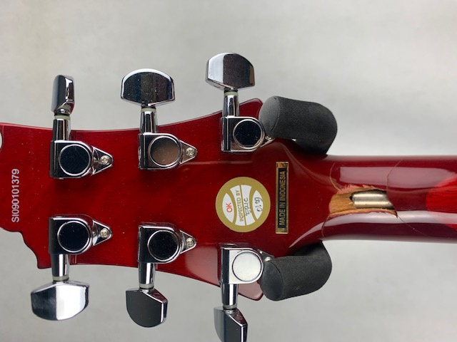 Duży uszczerbek materiału na łączeniu gryfu z główką gitary.