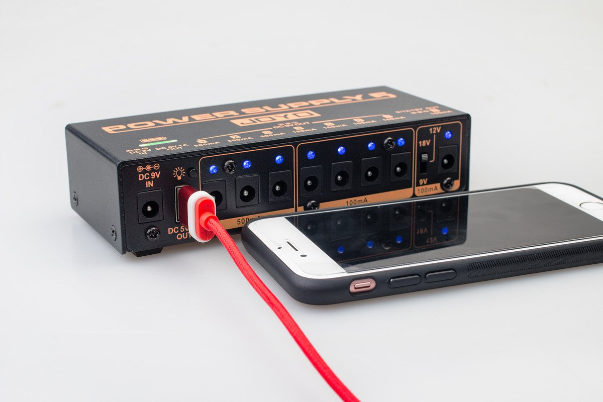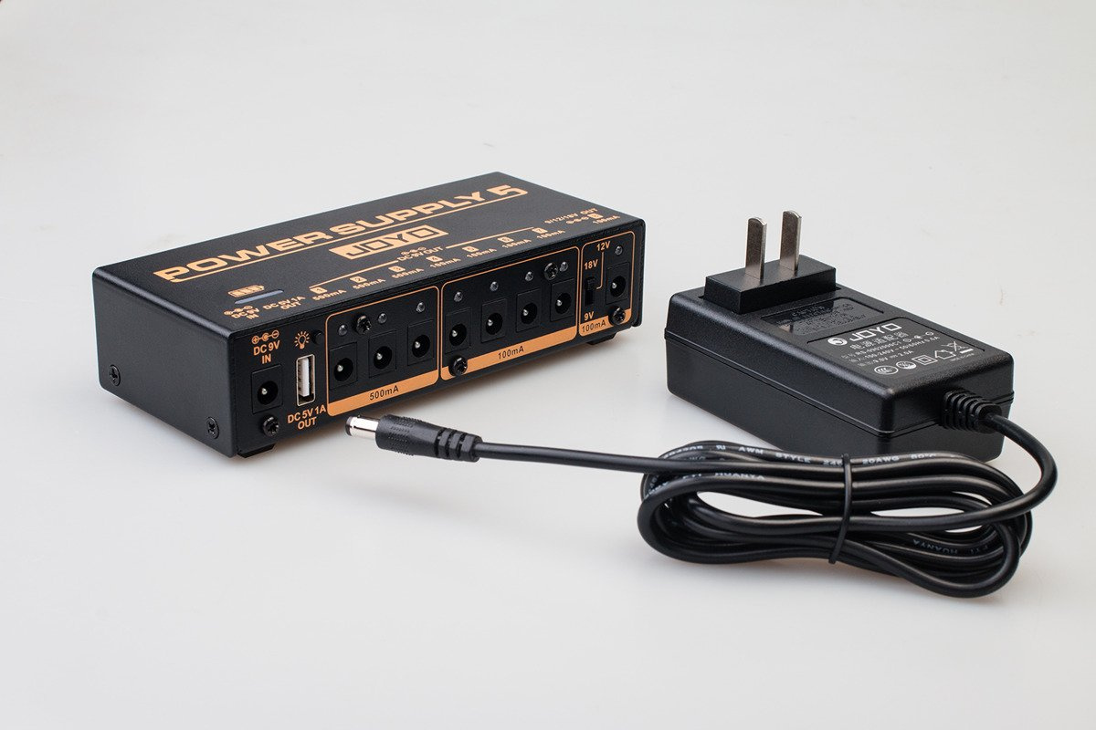 Joyo JP-05 to zasilacz posiadający 8 wyjść DC i jedno standardowe wyjście USB, jedno z 8 wyjść ma możliwość przełączania pomiędzy 9V, 12V i 18V, aby obsłużyć wszystkie efekty z Twojej kolekcji, dla których potrzebujesz więcej napięcia. 5V wejście USB pozwala na podłączenie mobilnych urządzeń.